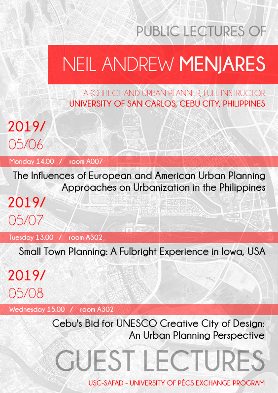 Április 8 (szerda) 15.00 órakor az A302-es teremben, Az előadás címe: Cebu's Bid for UNESCO Creative City of Design: An Urban Planning Perspective