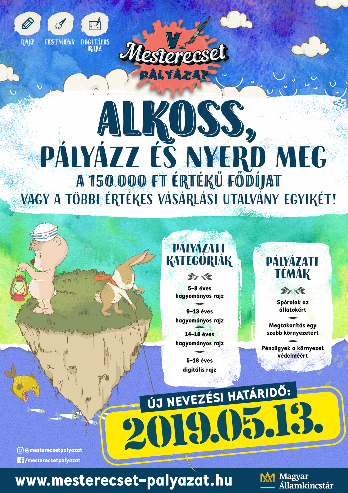 Örömmel értesítjük, hogy a Magyar Államkincstár által meghirdetett V. Mesterecset pályázat nevezési határideje meghosszabbításra került. Az új nevezési határidő 2019. május 13.